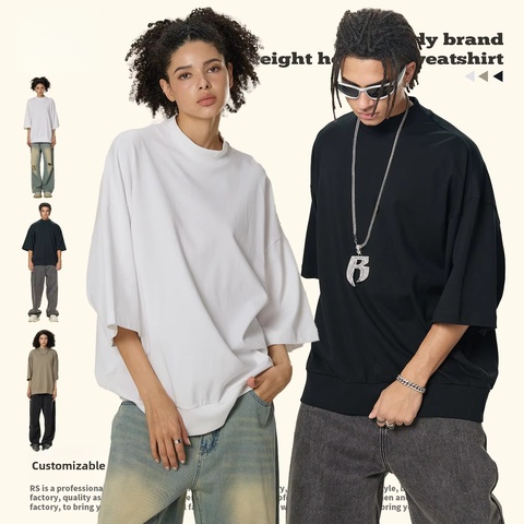2025 Nueva camiseta de algodón 100% para hombre, corte holgado, cuello alto pequeño, manga corta, cuello redondo, dobladillo roscado cuadrado, patrón sólido, tela de Jersey